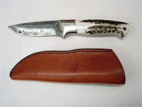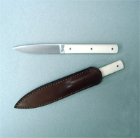 Petite dague de chasse à lame fixe de 10,5 cm et plaquettes ivoirine, étui cuir pouvant se porter à la ceinture ou dans la botte. Parfait pour la chasse au chevreuil.